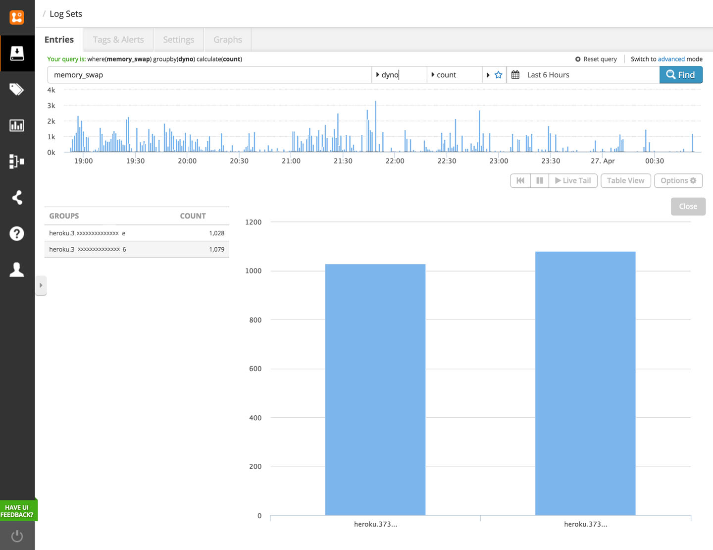 Since Dynos are uniquely identified in key value pairs, you can also use them to visualize data. In the example below, I'm visualizing how much swap memory each Dyno is using over a given period of time: