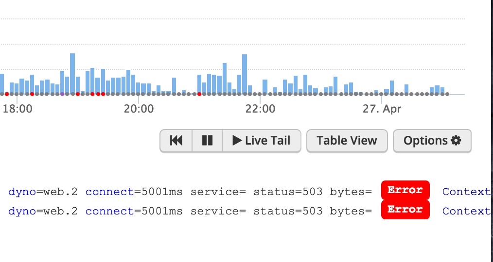 Finally, checking the Heroku Dyno related to errors in your logs could hint at Dyno-related issues. In the example below, we see that Dyno web.2 is related to both errors, which happen to be backend connection timeouts. While Heroku Dynos are allowed to fail and automatically restart on a different server, this finding could warrant you manually restarting your Dynos to alleviate the issue.