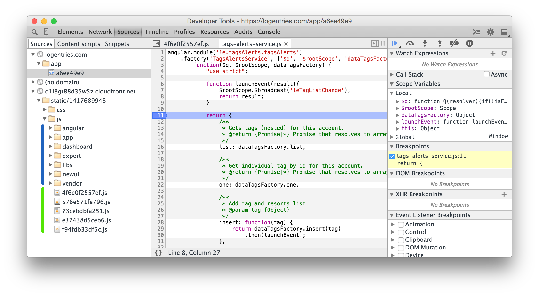 The files highlighted in green are compressed Javascript files; the folders highlighted in blue are generated from source maps and contain the original source code that's mapped onto the compressed files. We can set breakpoints on mapped code, inspect variables, step through, and do pretty much anything that we can with original code.