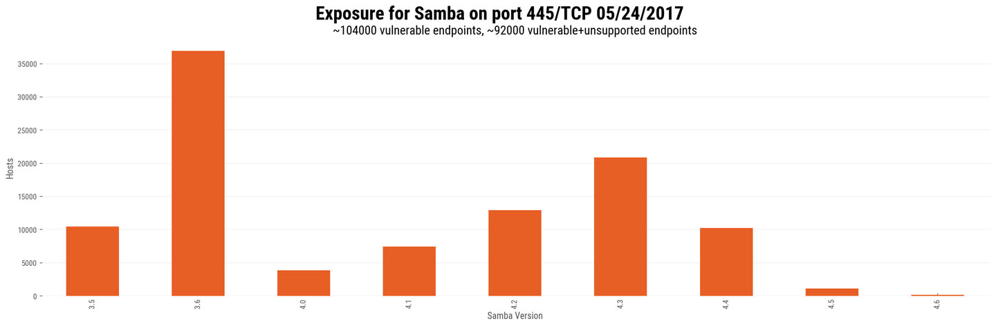 RESEARCH UPDATE – 5/25/17 – We have now run a scan on port 139, which also exposes Samba endpoints. We found very similar numbers to those for the scan of port 445. On port 139, we found approximately 110,000 internet-exposed endpoints running vulnerable versions of Samba. Of these, about 91% (99,645) are running older, unsupported versions of Samba (pre-4.4).