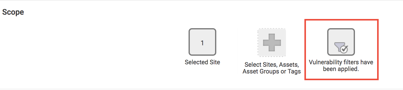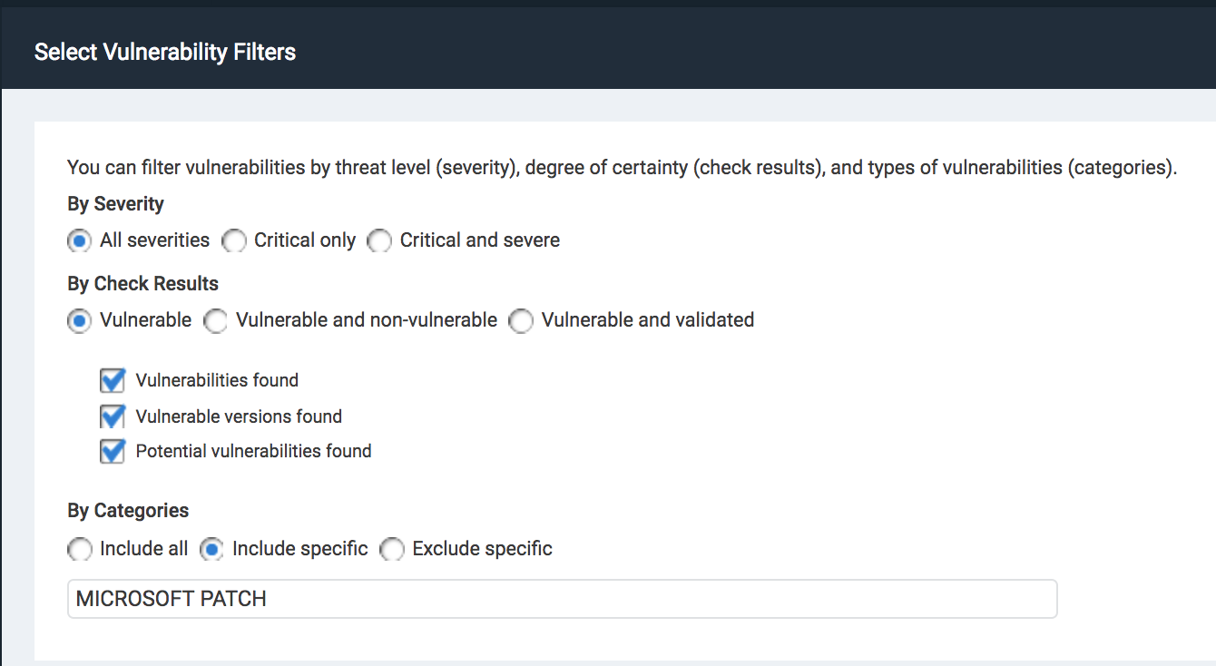 Vulnerability filters allow you to filter on vulnerability , severity, and categories. These can be applied in the scope section of any report that you are generating, making this option very flexible.