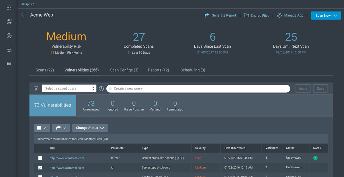 - Live Vulnerability View: Search, save filters, and set status and priority in a live, up-to-date view of all vulnerabilities detected across all of your scans. Live Vulnerability View helps you focus on what's next in securing your apps.