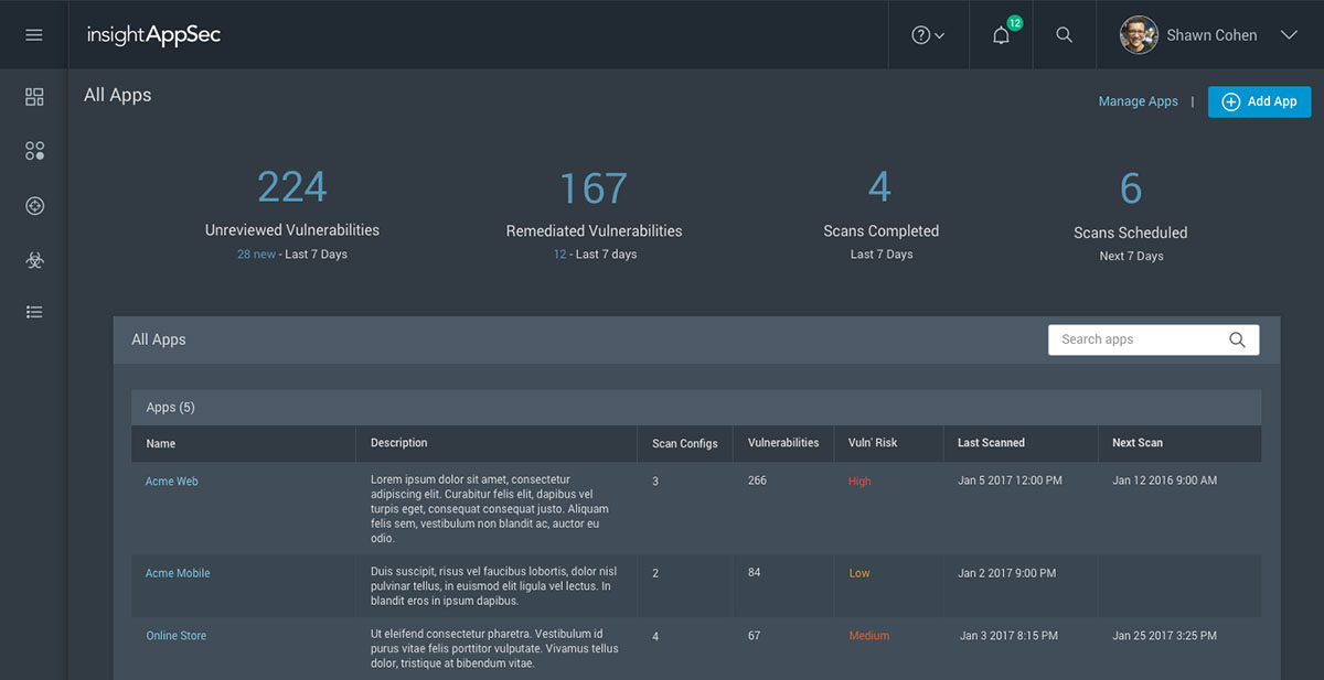 InsightAppSec helps you identify, manage, and fix application vulnerabilities with: