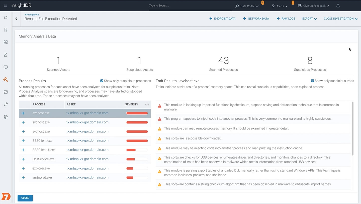 With the Process Memory Analyzer, every running process is analyzed for suspicious capabilities. If the process is performing suspicious behavior, such as injecting code, or looking up imported functions by checksum, this is flagged, and can be added to to the investigations timeline in InsightIDR. In the above screenshot, you'll notice that the feature ranks processes by risk, so it's easy to pick out anomalous processes which may have been victim to process hollowing.