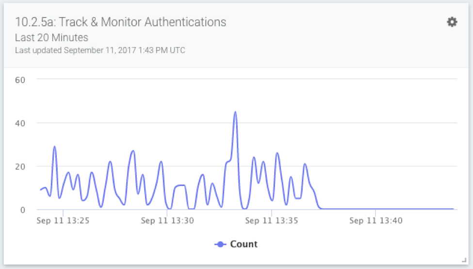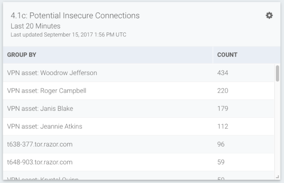 It’s important to identify traffic with destination to port 80, or the use of outdated SSL/TLS, especially for traffic around the CDE. This can help identify misconfigurations and ensure per Req 4, transmission of cardholder data is encrypted. As with all cards, you can click on the top right gear to pivot into log search, for more context around any particular IP address.