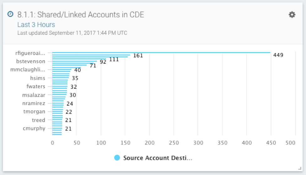 Credentials being shared by multiple people is dangerous, as it makes it much more difficult to retrace behavior and identify compromise. This card draws from asset authentication data to identify when the source account is not the destination (where(sourceaccount != destinationaccount) groupby(destinationaccount)), so your team can proactively reduce this risk, especially for the critical CDE.