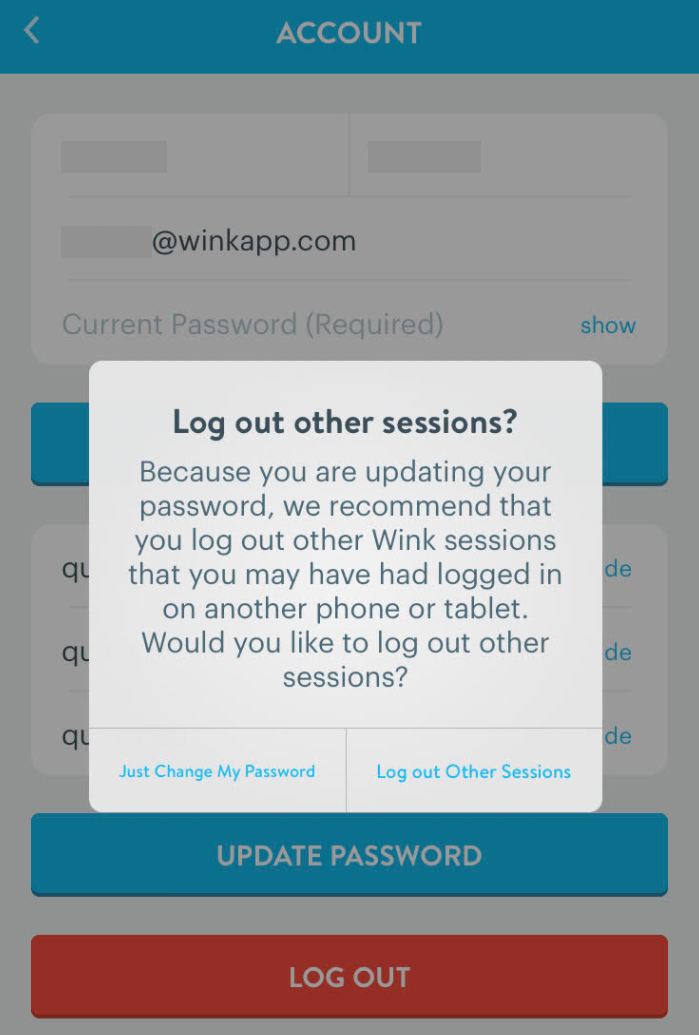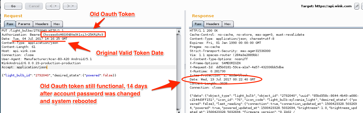 - R7-2017-19.2, CWE 613 (Insufficient Session Expiration): when users log out of the Wink Android application, the authentication token used for that session is not revoked, nor does the generation of new tokens revoke older ones. There is no way currently for users to see all valid authentication tokens connected to their account, but there is a method available to revoke all authentications aside from their current one (detailed below). No CVE was assigned to this issue, as remediation would likely be done on Wink's servers.