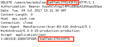 Further examination of the Wink app's use of OAuth revealed that the normal user logout process does not include OAuth token revocation. When the user logs out from the mobile application, it only sends a delete request for the mobile device tracker in specific (as shown in Figure 2 below). This tracker plays no direct roll in the authentication process.