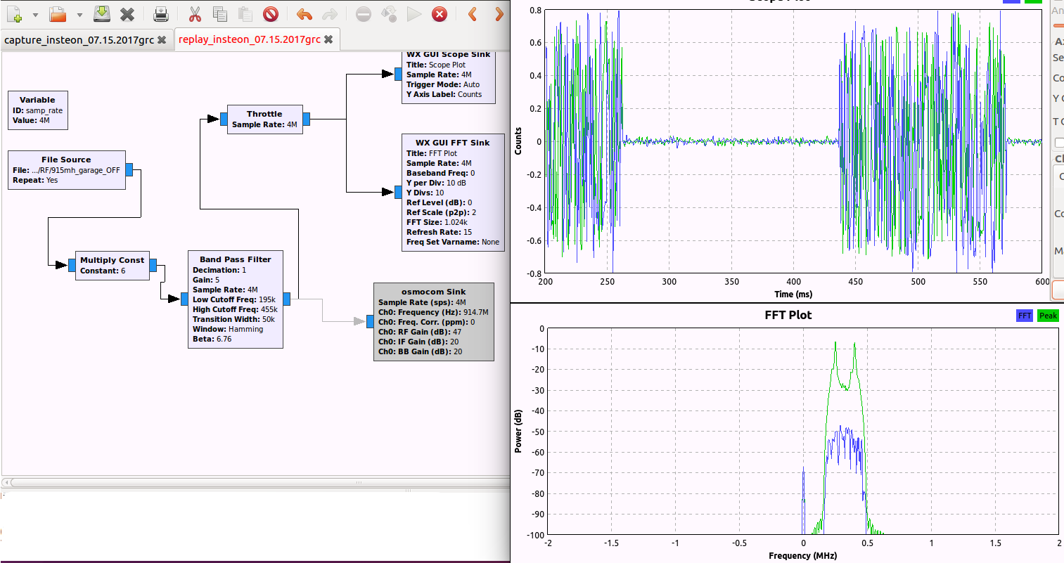 To test the Insteon Hub's security against replay attacks, an Insteon Garage Door Control Kit (Device 43) was configured via an Insteon Hub (2245-222). Using software-defined radio (SDR), the 915MHz radio signal used to open and close the door via the Garage Door Control device was captured. Once captured, the signal was filtered to remove background noise and then replayed to successfully actuate the Insteon Garage Door Control device. This confirmed that the Insteon RF protocol is vulnerable to replay attacks, and is shown in Figure 3 below: