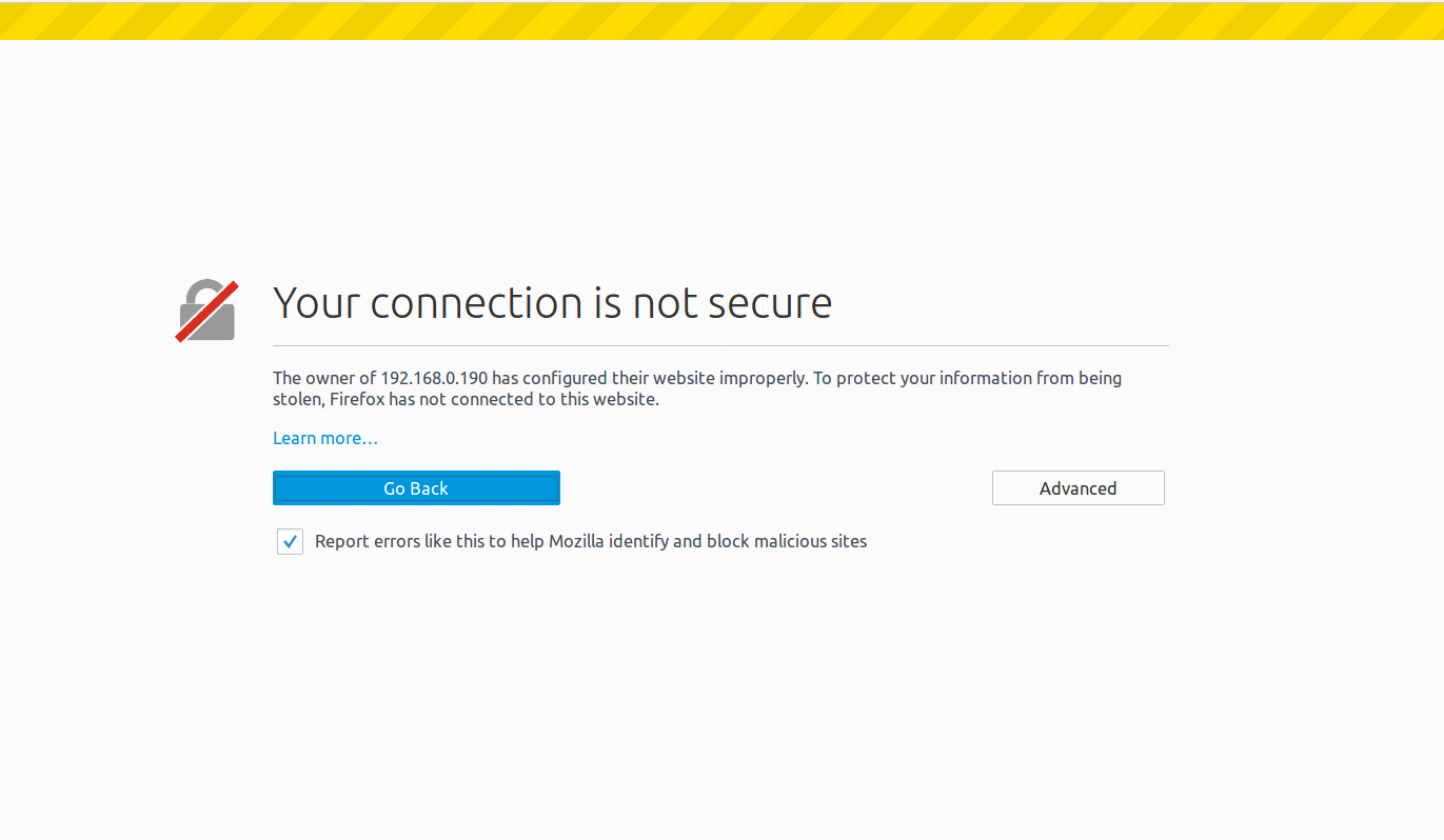You should see an error alert in the above page. Because, your server self-signed certificate is not issued by a trusted certificate authority.
