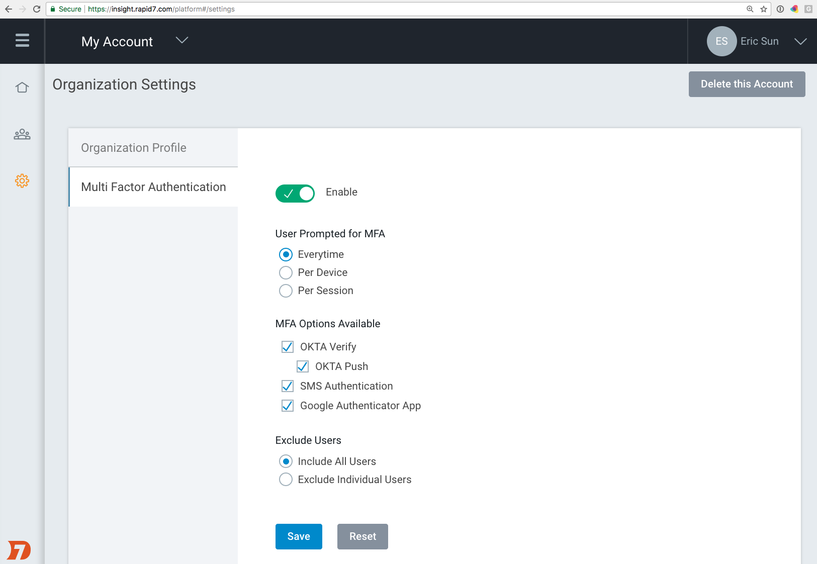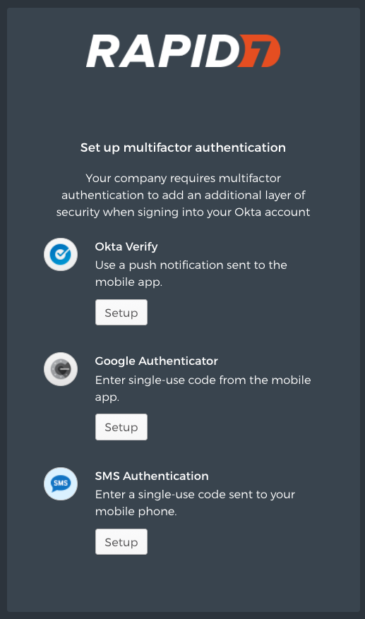 You can now mandate InsightIDR logins to require a second layer of authentication in the form of Google Authenticator, Okta Verify, SMS Text, or security question.