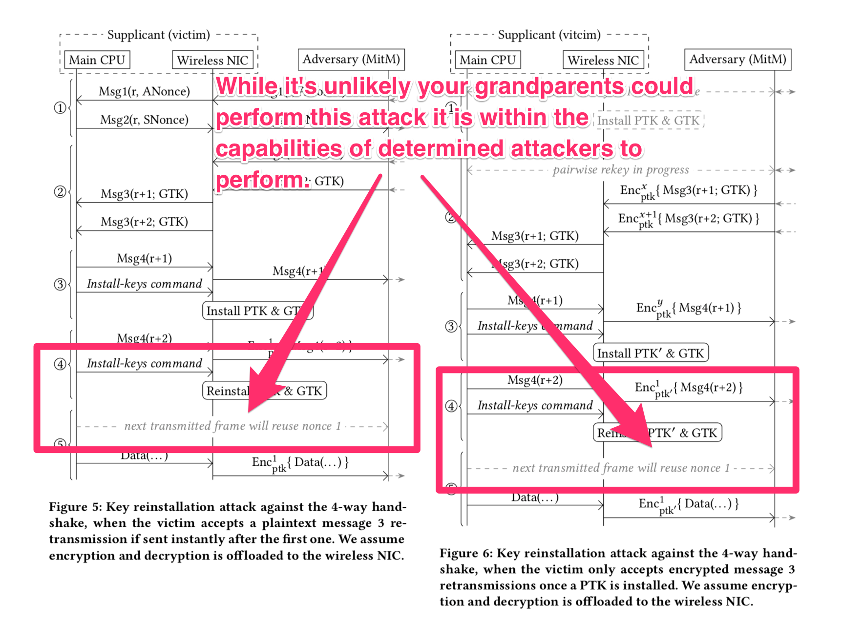 Hence the name KRACK: Key Reinstallation Attack*s. When two or more data streams are encrypted with the same key, it’s much, much, much easier to decrypt the contents of the streams.