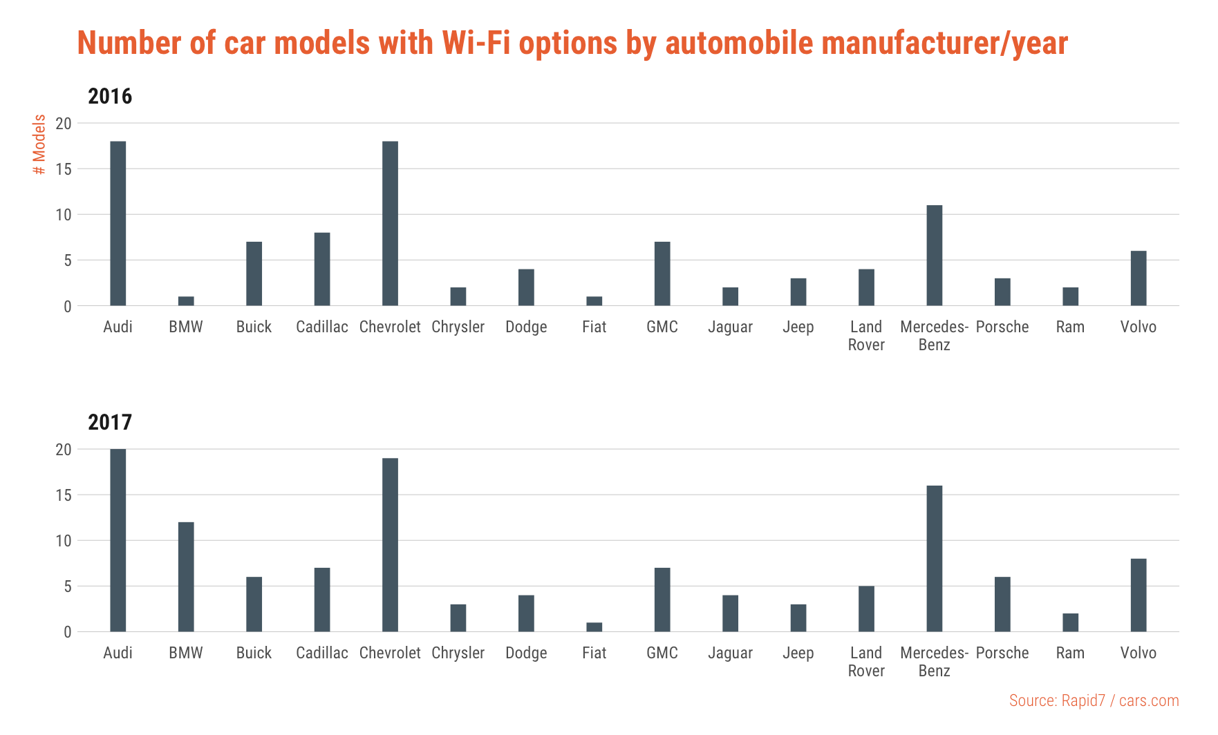 Finally, it's worth re-emphasizing that there are many devices in the "Internet of Things" (IoT) category which you need to patch. Not just at home, either. Many building HVAC systems and other "industrial" IoT environments rely on 802.11 wireless networks for data upload and command-and-control. One area we've not seen mentioned much is that of Wi-Fi in automobiles. Many modern cars are Wi-Fi clients and even more are now Wi-Fi access point "hubs". In fact, there were 97 automobile models with Wi-Fi options and 123 in 2017.