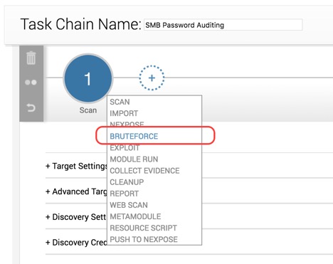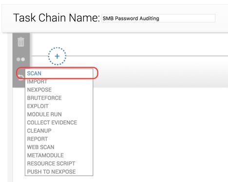 Next, pick a name for your Task Chain. In my case, I’ll call it “SMB Password Auditing”. Then click on the plus sign to assign the first task of the chain, and choose Scan, like this: