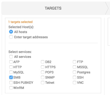 The Bruteforce view is broken down into three sections: Targets, Credentials, and Options. Let’s start with Targets, which should be configured this way: