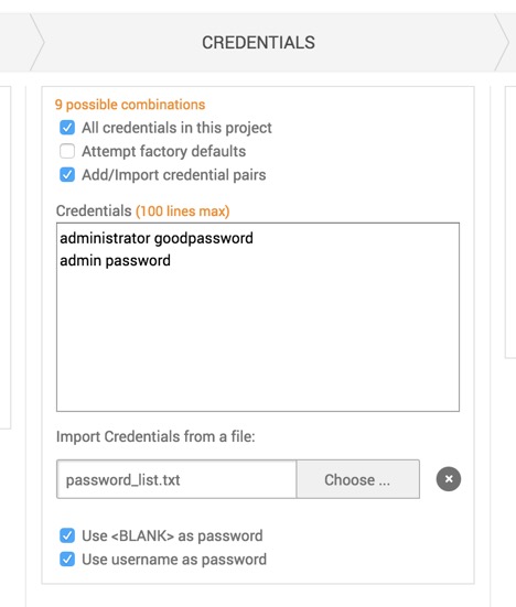 For the Credentials section, ideally you want to at least try all the stolen passwords that you know of, either from a previous pentest engagement, or from a public list (sorry to say). If the current workspace already has some stolen passwords, that’s a good source to try. If not, try to import them from a list. If you’re not aware of any stolen ones, you should focus on the common ones. At the end, your configuration will probably look similar to this: