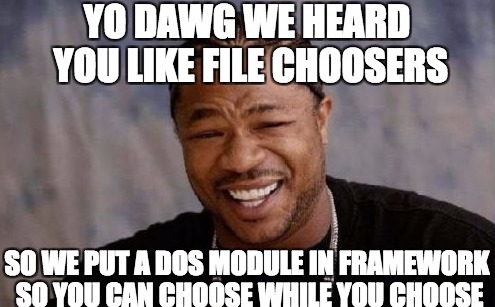 Big ups to @RootUP for the DoS module targeting a vulnerability in IBM’s Lotus Notes client (CVE-2017-1130). The DoS module targets the web interface via malicious JavaScript (😱). An enterprising ‘sploiter can share a URL with the injected code that triggers not one, not two, not even three…but uncountably-infinitely-many file chooser dialogs (no human can cancel them fast enough!). This in turn hangs the app, rendering it unusable. I heard you like file choosers…