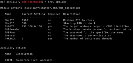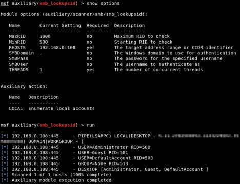 If I don’t have any luck with null sessions, my next step would be anonymous SID-to-name translation with the smb_lookupsid module. I use this as a secondary option because it’s going to be slower than null sessions.