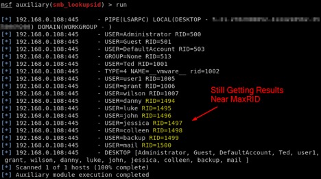 Here’s an example of using smb_lookupsid for local user enumeration against a test system, with the MaxRID option set to 1000: