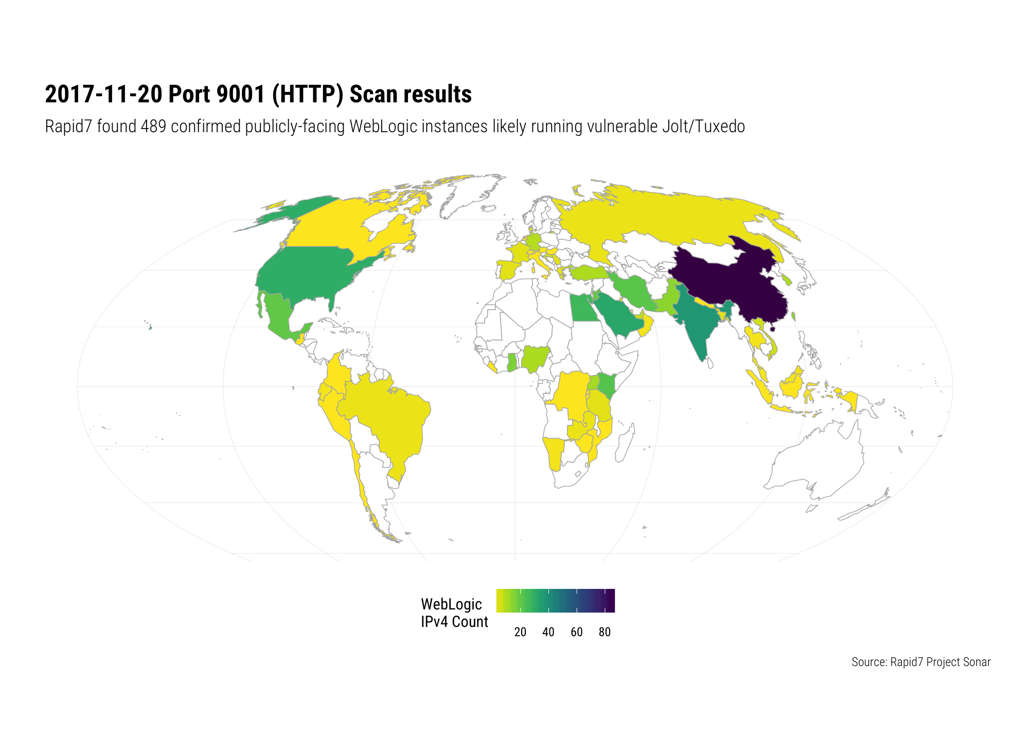If you have had to make such alterations to the reference architecture, now would be a great time to re-think them and at least create host, switch, router and/or firewall access control lists (ACLs) or rules to prevent general access to the ports and services that are exposed. Of note, ERPScan found over 1,000 PeopleSoft instances hanging off the public internet and, in a highly targeted HTTP scan today on port 9001 today (2017-11-20) Rapid7 Labs identified nearly 500 likely vulnerable WebLogic instances across the globe: