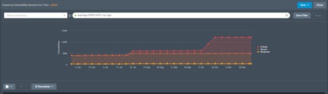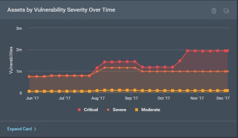 Remember, these cards can be freely moved around, added, or removed, so let’s pull one that's particularly interesting for GDPR to the top: “Assets by Vulnerability Severity Over Time” shows how the number of critical, severe, and moderate vulnerabilities have changed over time.