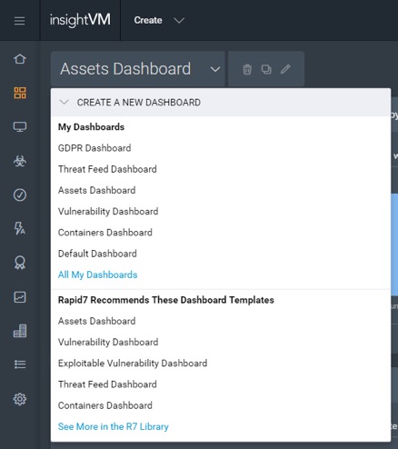 First, we’ll create a general dashboard using one of InsightVM’s pre-built templates. The “Assets Dashboard” is a good place to start as this comes pre-built with most of the cards we would find useful. To do so, click on the dropdown on the dashboards page and click on “Assets Dashboard” under the Rapid7 Recommended section.