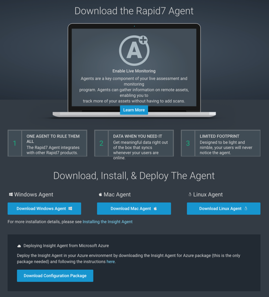 Earlier in the year, InsightVM, our vulnerability management solution, added live monitoring with Agents for Windows, MacOS and major Linux distributions. Rapid7 Insight Agents conduct vulnerability assessment from within an asset. Instead of performing a full network vulnerability scan of a device, Agents collect an initial baseline and then just the changes from that baseline to understand variations in vulnerability exposure. This approach allows Agents to be lightweight, unobtrusive, and continuously vigilant. Try out Agents to collect vulnerability data from: