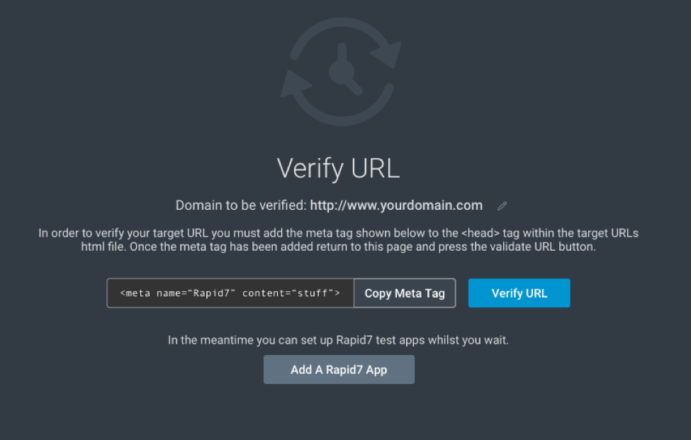 But before you start scanning your own application with the InsightAppSec free trial, you’ll need to validate your application’s domain. This requires adding a custom-generated meta tag to your application’s root path.