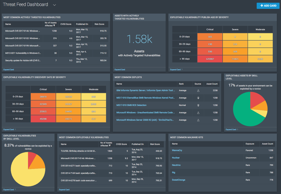 “Threat intelligence provides an additional pathway for strategic patching” - CVSS scores are usually not enough to successfully prioritize vulnerabilities in a modern network; customers are left sorting through thousands of “critical” vulnerabilities with little context of which ones truly present the most risk to the network. InsightVM includes integrated threat feeds from our own research as well as third party sources so that security teams can prioritize vulnerabilities used in real world attacks. Combined with our 1-1000 risk score that incorporates malware exposure, exploit exposure/ease of use, CVSS, and vulnerability age, InsightVM helps security teams think like an attacker, and take a risk-based approach to prioritizing vulnerabilities.