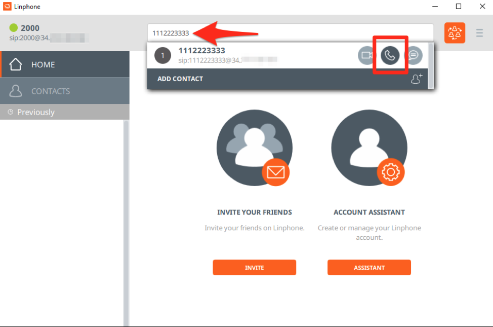 You can then make calls with the Linphone client using our Asterisk server by entering the destination telephone number in the text box at the top of the program.