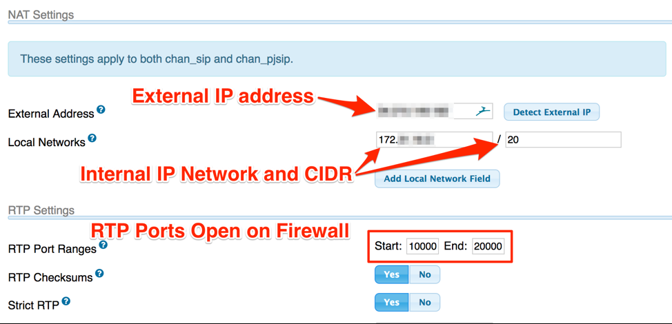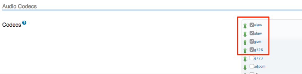 - Ensure ulaw, alaw, gsm, g726 codec checkboxes are ticked