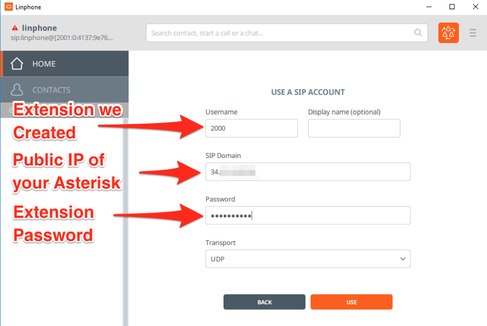 Enter in the username (extension), public IP of your Asterisk, and the password configured for the extension, leaving everything else as default: