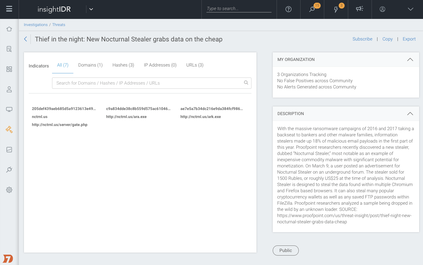 Any malicious URLs can be added to InsightIDR, which will then automatically match against future DNS, firewall, web proxy, and other user data. If a user accesses that URL in the future, InsightIDR can automatically alert you or track the action as a notable user behavior. After all, the key to preventing future compromise lies in translating your investigation findings into threat intelligence, and feeding that back into your proactive defenses.