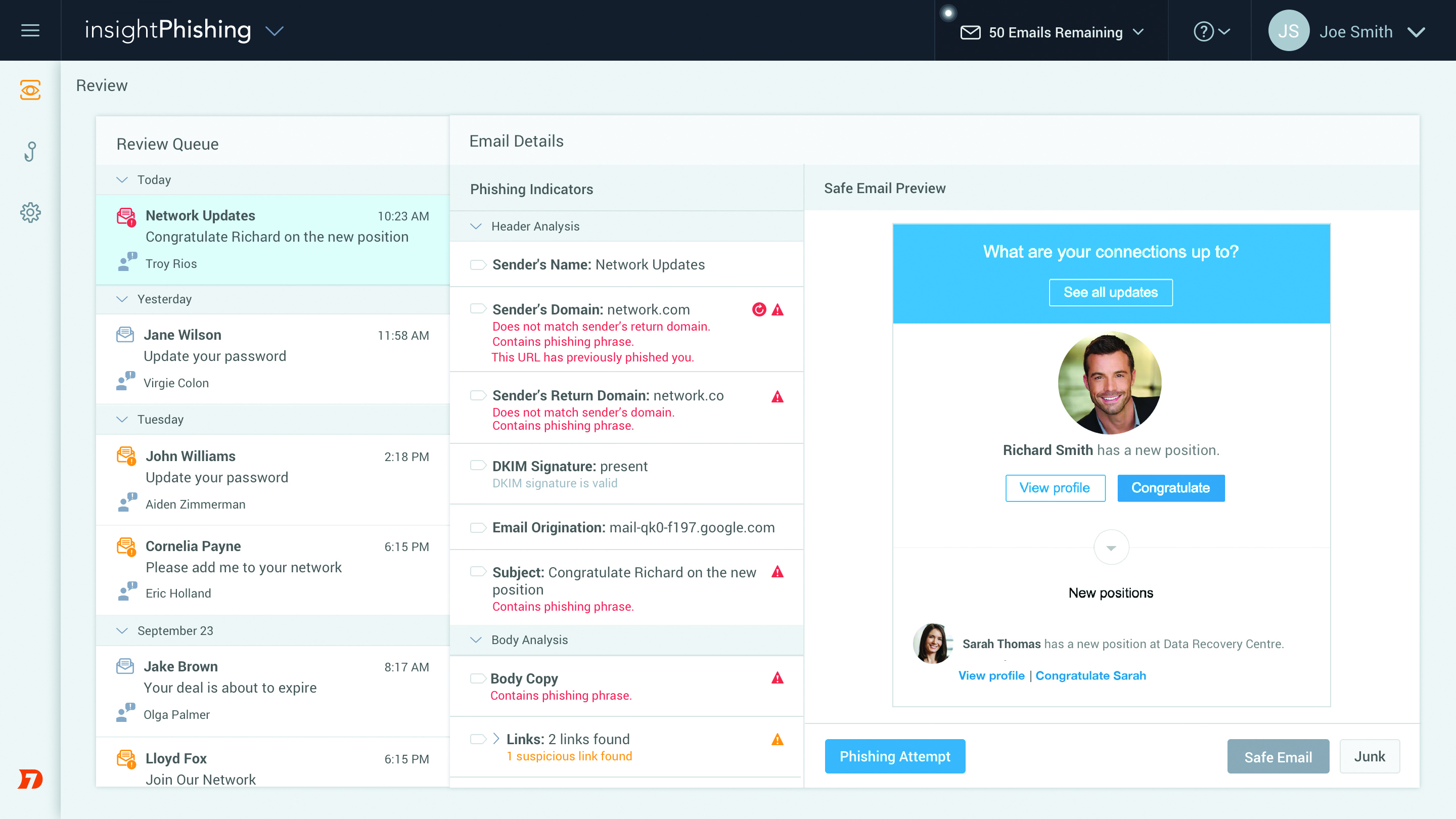 However, even with automated alerting, phishing investigations take too much manual effort, even if they’re just to confirm that a suspected phishing email is benign. That’s where SIEM technology comes in, giving you the network-wide visibility required to identify compromises across your environment, right down to the exact users who were affected. Together, SIEM and phishing technology can provide you with a defense-in-depth approach.