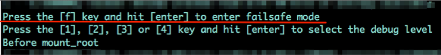 The most common method of UART access will typically challenge you for a password to gain full root access, and if you do not know it, you might be stuck there. Before giving up, there are a number of methods to consider. First, does the device have a default password? Check that out by doing a little product recon online or in the user manuals. If that doesn’t work, examine the device’s boot up logs in the console, since you can often find a couple interesting methods for gaining further access. One method I’ve come across allows you to place the device into “failsafe mode” by pressing “f” then the “enter” key at a given point during the device boot up (Figure 3).