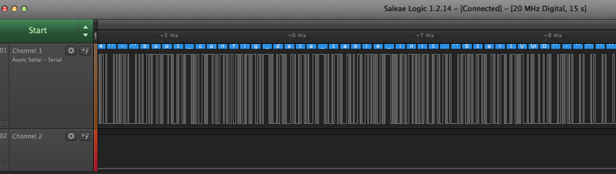 Besides the obvious example shown above, my second favorite method is leveraging a logic analyzer, such as a Saleae product. A good logic analyzer allows you to connect to multiple header pins and use protocol decoding for the activity you are attempting to analyze, in this case asynchronous serial. (Figure 2).