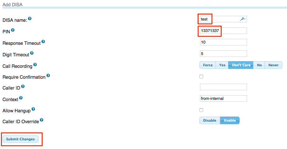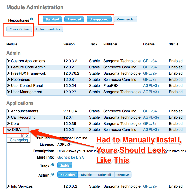 With this step, we’ll be setting up the bridge that will link the external phone number to your PBX. For network engineers, this is functionally similar to setting up a VPN. You’ll need to ensure the DISA module is installed in your version of Asterisk.