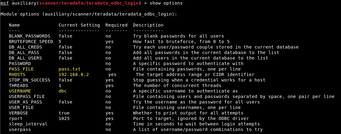 In the example below, we’ve loaded the module, set a PASS_FILE containing the default ‘dbc’ password and ‘1234’, set our target with RHOSTS, and set the USERNAME we’re guessing to the default ‘dbc’: