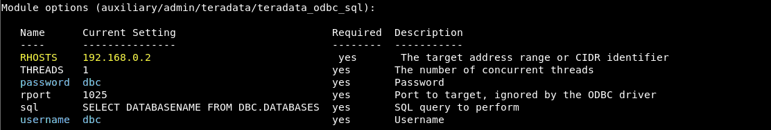 Once we’ve identified credentials, there is another module we can use to run SQL queries. The built-in ‘dbc’ credentials are the default username and password option values. In the example below, we’re using them after setting our target host: