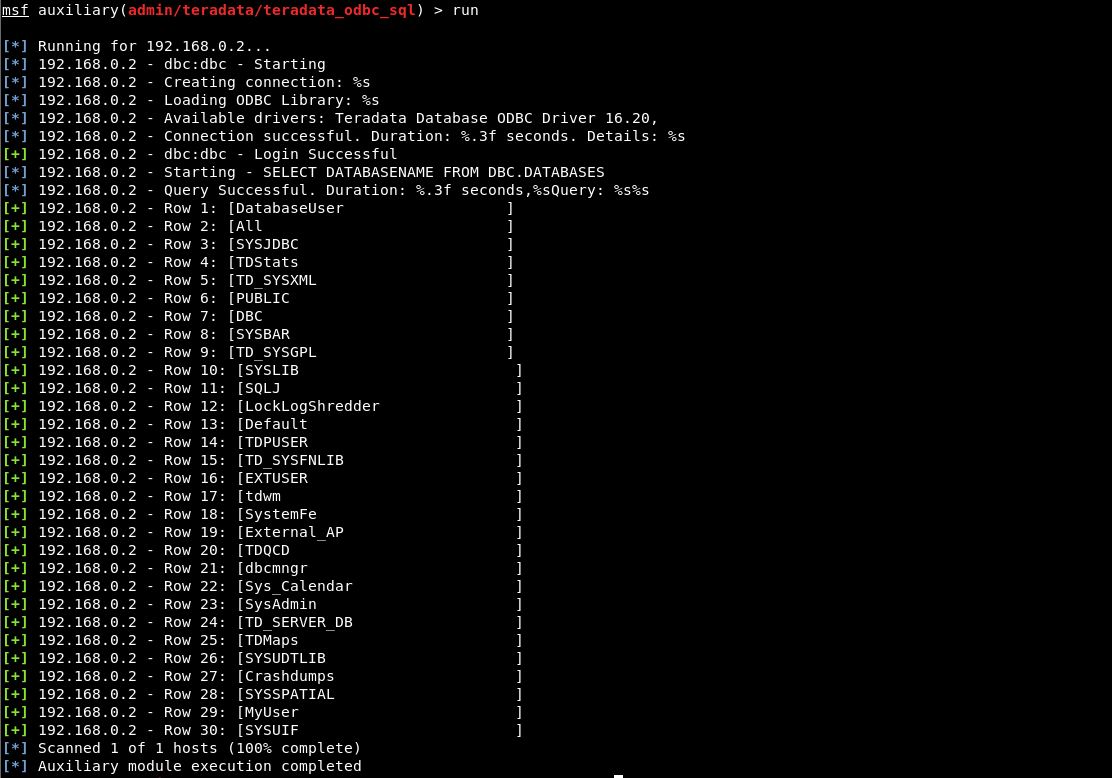 We’ve created an auxiliary login scanner module for Teradata, as well as an admin module that you can use to run SQL queries once you have found credentials. Both of these are now in Metasploit.