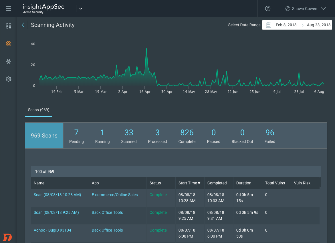 InsightAppSec provides an interactive activity dashboard that details the number and frequency of scans and lets you zero in on specific periods of time. You can take a closer look at significant trends, easily zoom to search within a given date range, and filter based on status. Browsing completed scans shows how recent the vulnerability data for each of your apps really is, with the ability to check whether you have met your scanning targets (for example, every 30 days, or within 14 days of deployment). You can also look for long-running scans that have yet to start or for any that have failed to complete.