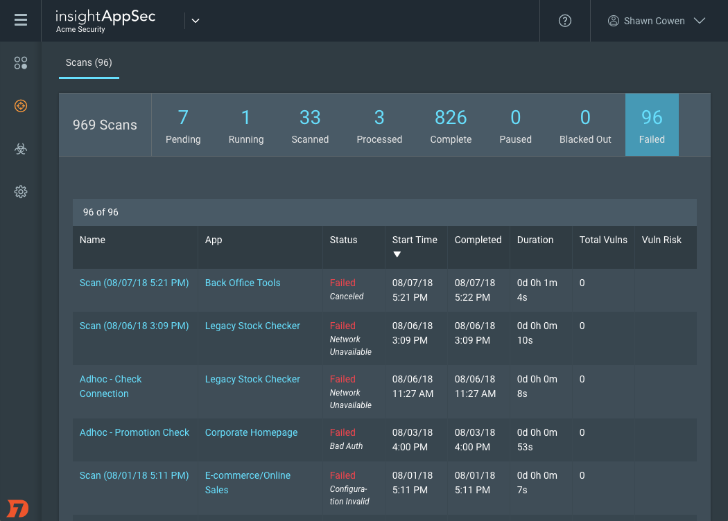 With InsightAppSec, it is easy to check at a glance which apps were unreachable and where there were authentication failures for the critical web applications in your portfolio.