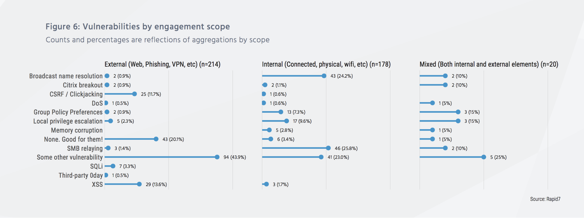 Since “Under the Hoodie” is a compilation of both internal and external penetration testing, it’s worth observing how vulnerabilities differ between the two. Here’s what we found: