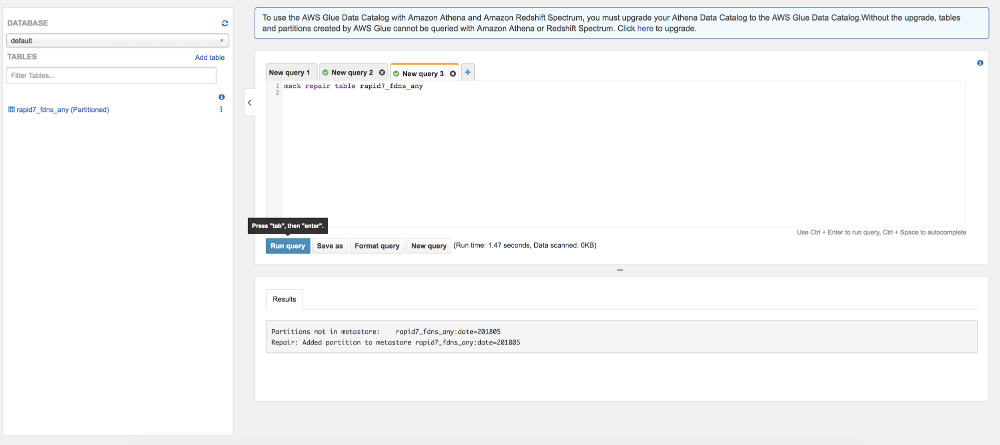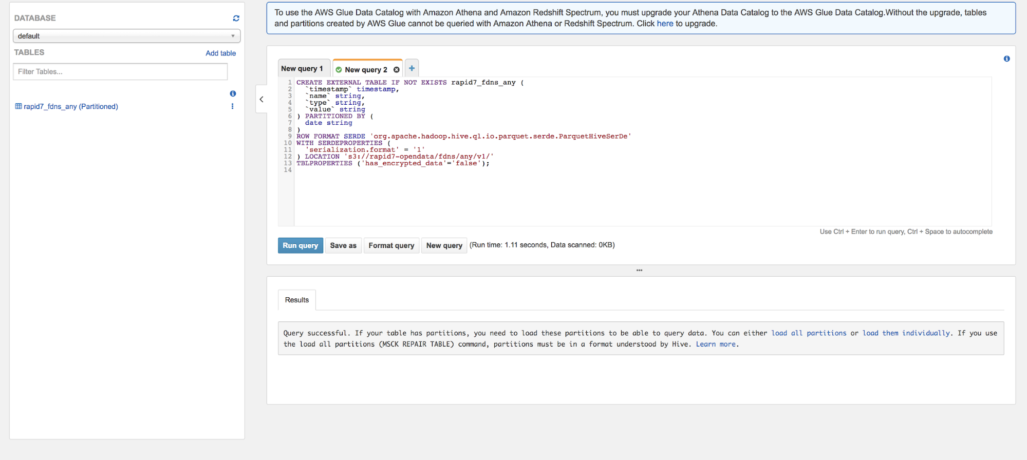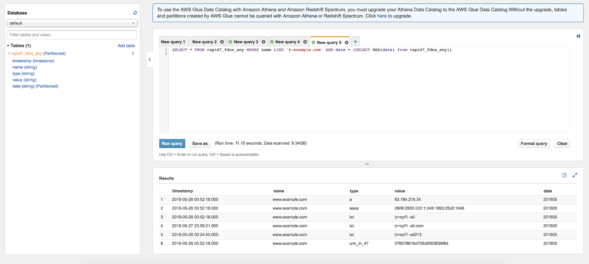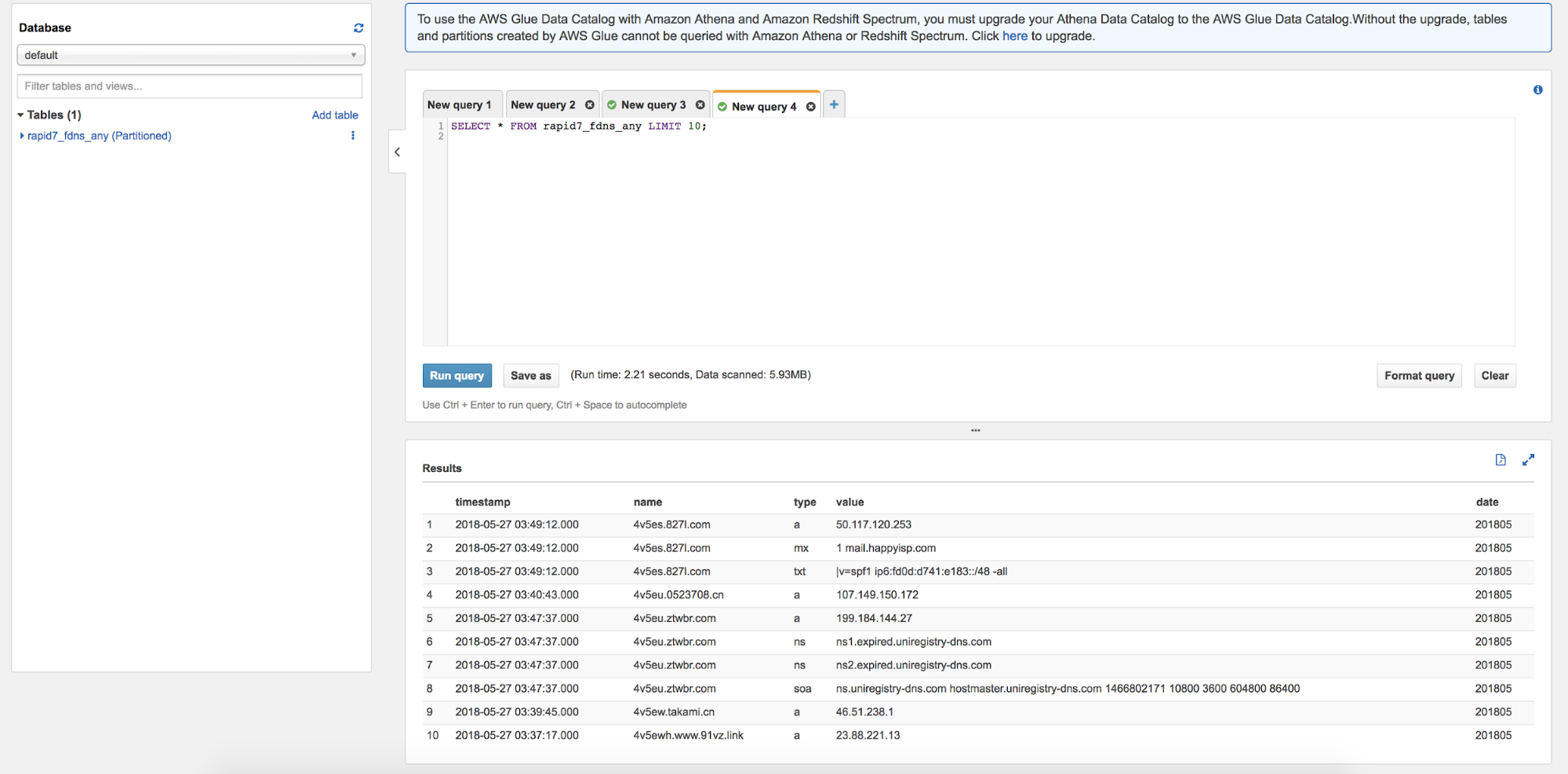 Now you have a table called rapid7_fdns that reflects the parquet data in the s3 buckets! To help keep the costs low when querying, we’ve partitioned the data via date. Datasets will be updated once a month, so to make sure your table is using the latest partitions. It’s a good idea to repair the table both now and periodically as you continue to use the dataset.