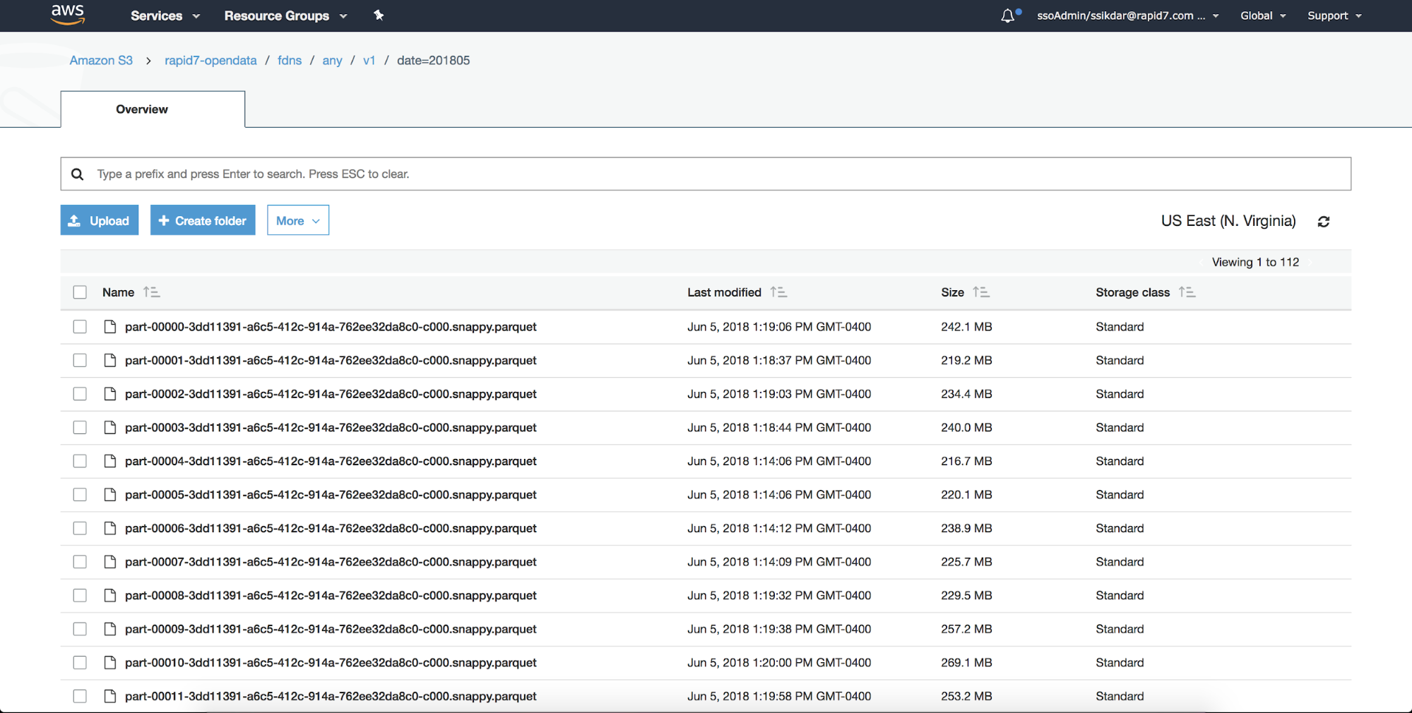 If you go to s3/buckets/rapid7-opendata/fdns/any/and take a look at the buckets where the data is stored in S3, you’ll notice the data is stored in compressed parquet formats. This is great for storage, but not the most straightforward for exploring the data. Luckily, there’s AWS Athena, which provides a quick and painless way to query the data.
