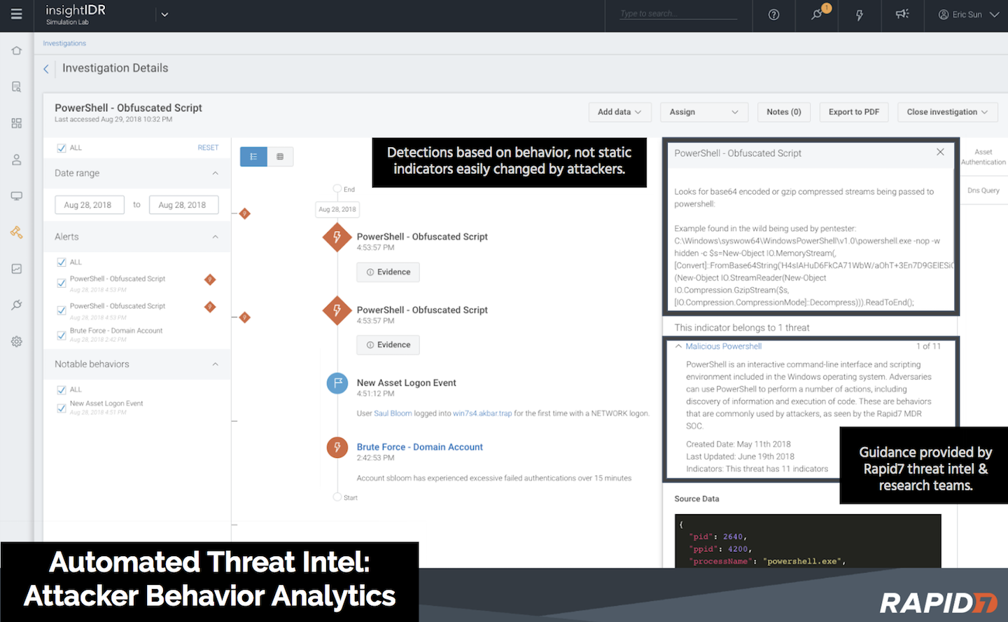 Combined with threat intelligence, UBA and ABA offer rich information that helps our SOC team better detect and respond to threats. But if there is no way to correlate all of these details, it can be a long and grueling process. This is another feature built right into InsightIDR.