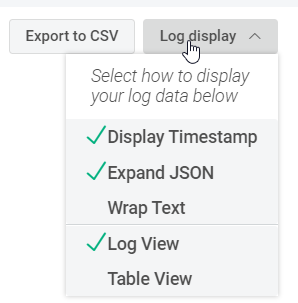 A handy feature of InsightIDR is the ability to change how the log entries are displayed on the page. Use the Log Display dropdown to change the view to whatever you like best. We recommend using Log View with Expand JSON selected. If you haven’t yet used this option, select it now and notice how it displays one field of parsed data per line. As you get accustomed to Log Search, this view can help you quickly identify which fields of data have been parsed from the logs.