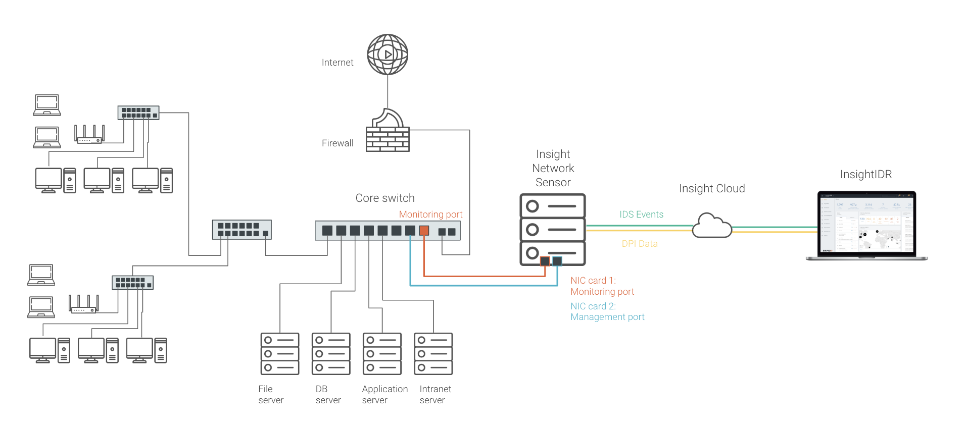 The image below shows a good approach when it comes to network traffic monitoring for most networks. A SPAN or mirror port is configured at the network core, which allows for the capture of any traffic passing through. In my example, this would allow me to capture traffic going to and from the internet, as well as traffic associated with important servers.