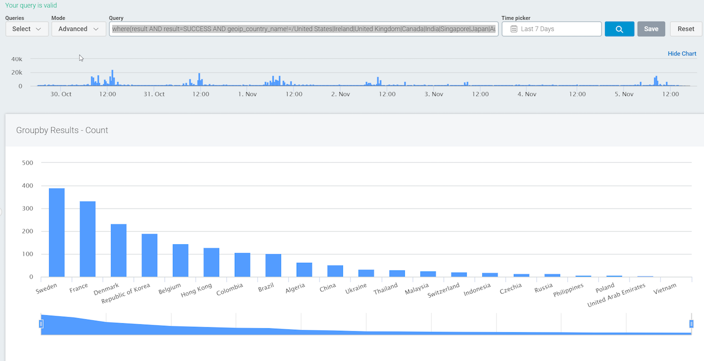 where(geoip_country_name AND result=SUCCESS AND geoip_country_name!=/United States|Ireland|United Kingdom|Canada|India|Singapore|Japan|Australia|Germany|Mauritius|Netherlands/)groupby(geoip_country_name)