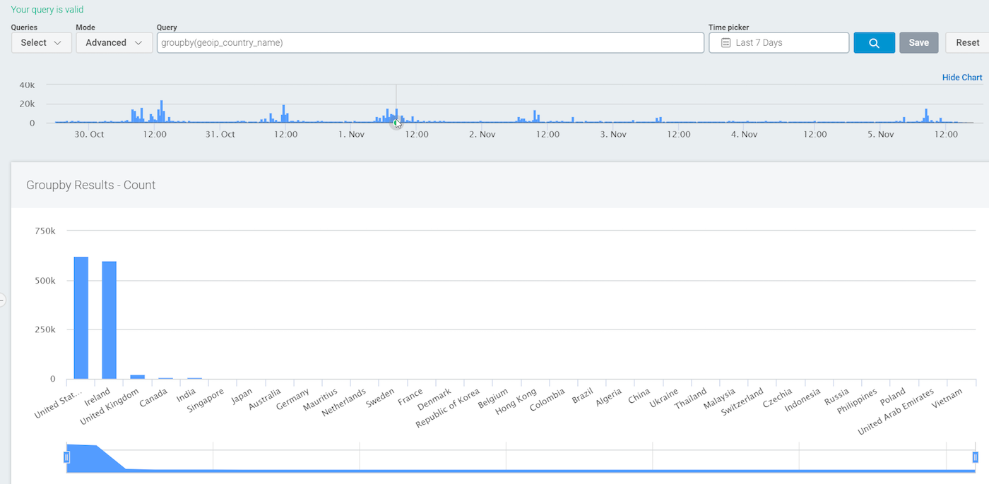 Note that with this query, if there are logs that do not have the specific parsed field geoip_country_name, they will not show up in the results.